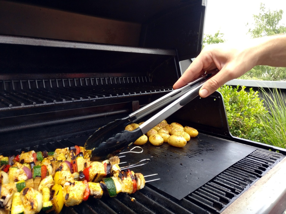 Wenn die Kartoffeln schön angegrillt und fast gar sind, kommen dann die Tandoori Chicken Spieße auf den Grillrost. Dazu verfrachte ich die Rosmarin-Fächerkartoffeln auf den Gemüserost und ziehe die BBQ-Grillmatte zur Seite. Auf dem heißen Grillrost, der nun frei geworden ist, kann ich jetzt die Hähnchenspieße grillen.