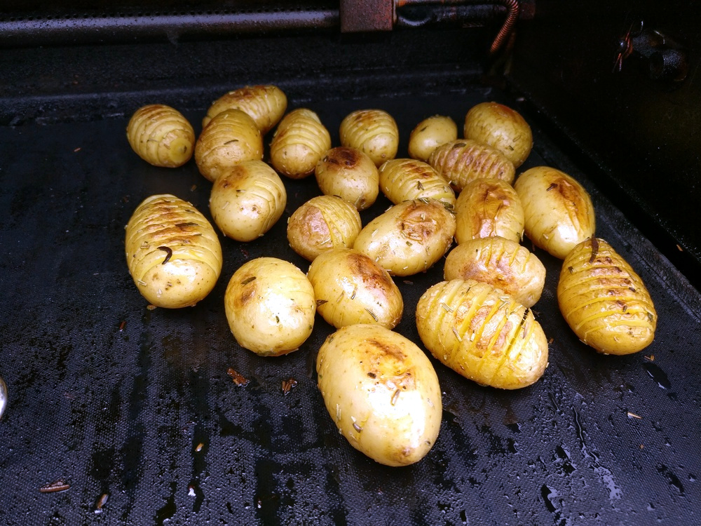 Der Broil King Regal 490 darf mit zwei Brennern auf 2/3 Leistung für zehn Minuten vorheizen. Auf der BBQ-Grillmatte grille ich dann zunächst für 15 – 20 Minuten (je nach Größe der Kartoffeln) die Fächerkartoffeln bei 1/4 Brennerleistung an.
