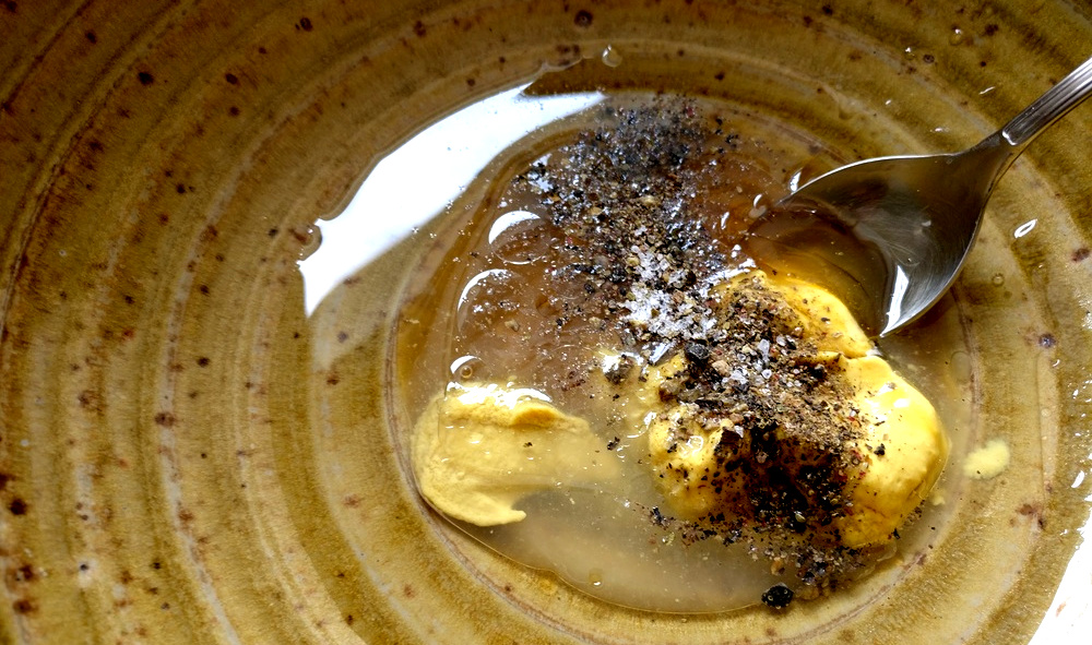 2 TL Senf, mittelscharf 2-3 TL flüssigen Honig Sonnenblumenöl 2 Spritzer Zitronensaft Pfeffer Salz