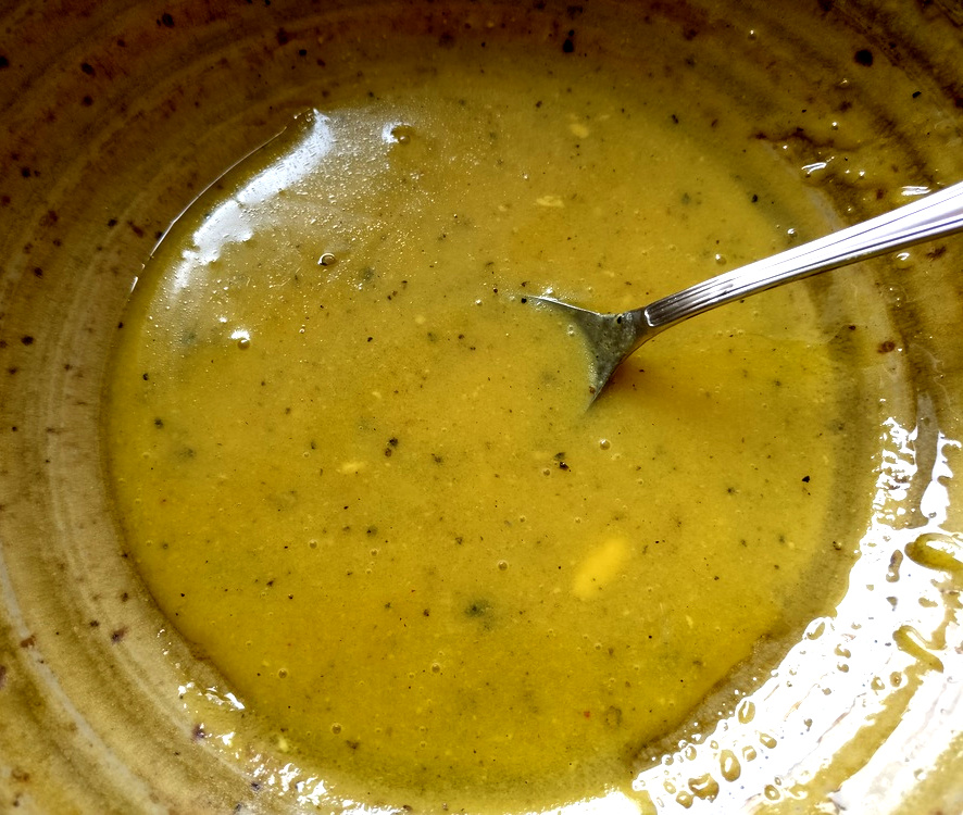 Die Zubereitung des Honig-Senf-Dressings ist sehr einfach. Dazu gebe ich alle Zutaten in eine Schüssel und verrühre alles so lange, bis sich ein schön cremiges Dressing ergeben hat.