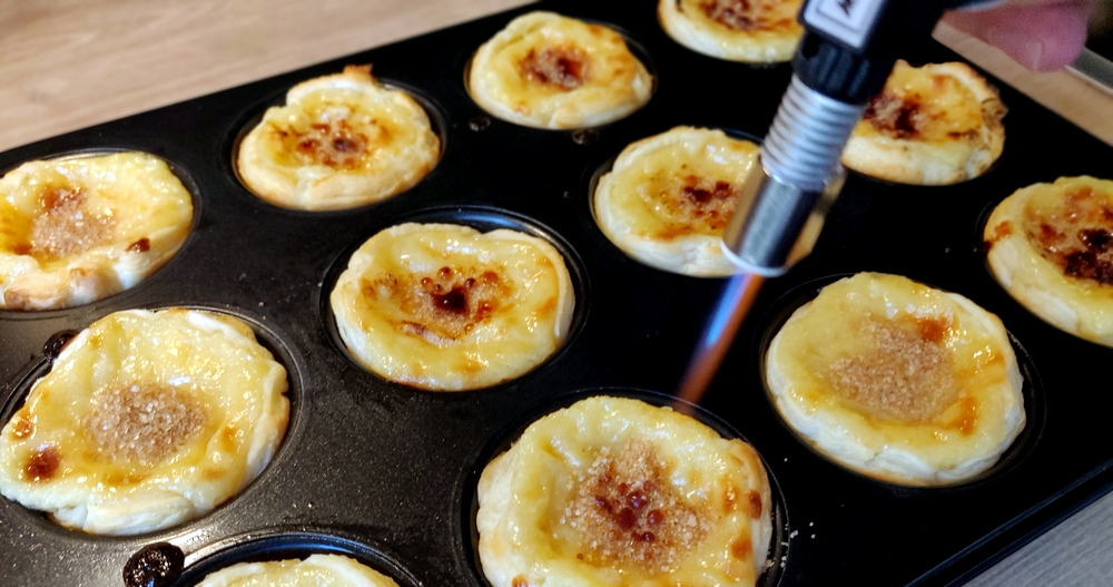 Mit dem Bunsenbrenner und etwas braunem Zucker sorge ich dann für die karamellisierte und knusprige Oberfläche. Bevor ich die Pastéis aus der Form nehmen kann, muss ich sie etwas abkühlen lassen. Sie sind sonst zu weich, um sie heil aus der Form zu bekommen. Das ist nämlich auch das Schwierigste an der Zubereitung – die kleinen Leckereien heil aus der Muffinform zu bekommen! Am besten hat’s bei mir mit einem Löffel funktioniert.