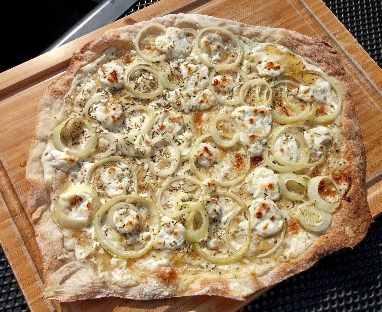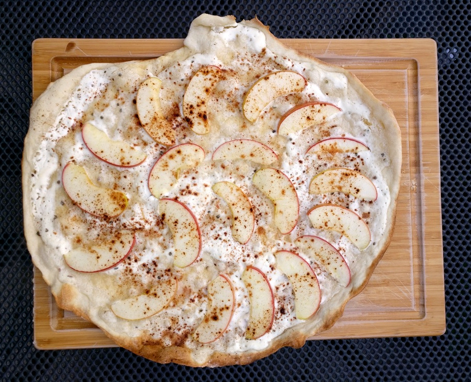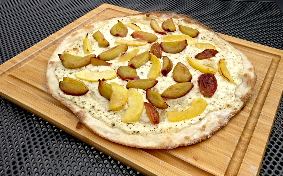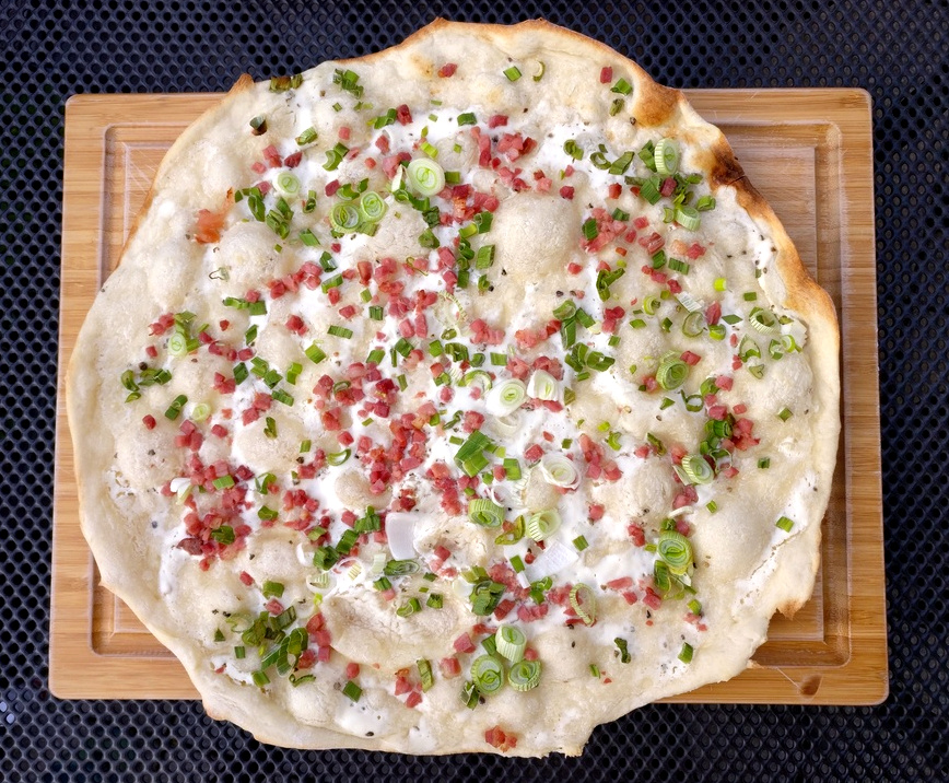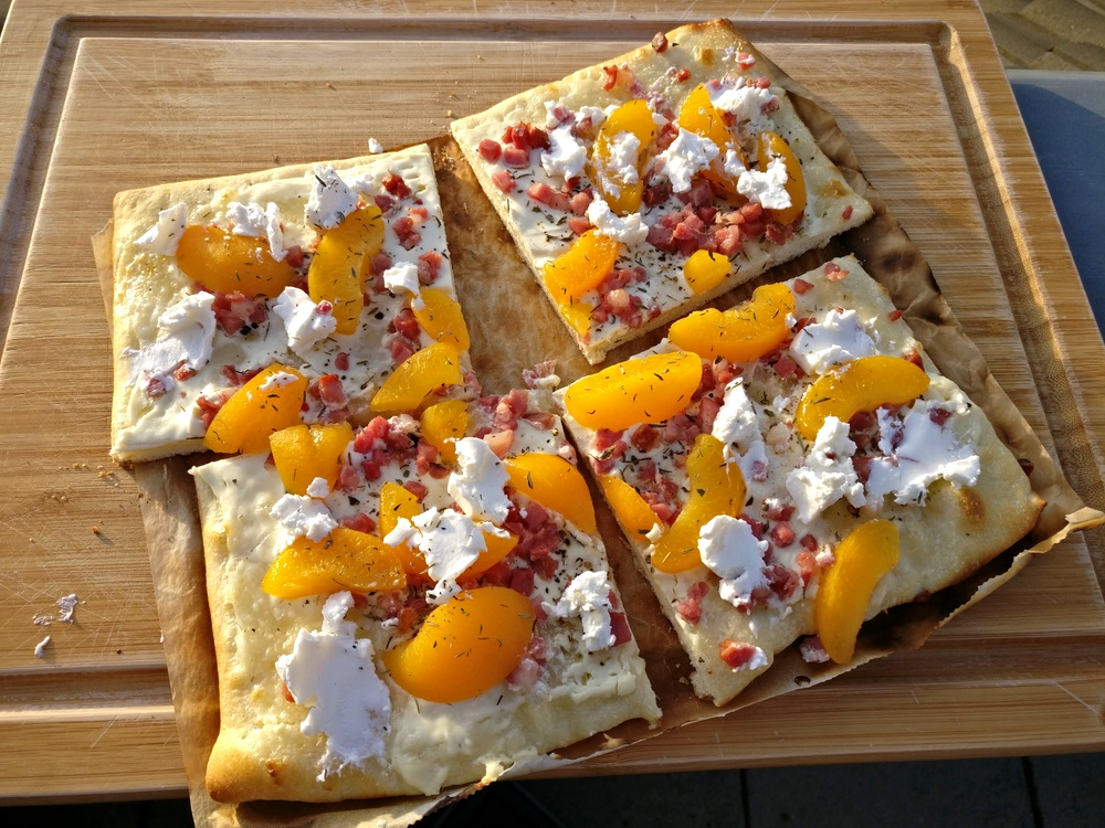 Auf dem Outdoorchef habe ich dazu gerne den Pizzastein verwendet, da dieser dem Teig die Feuchtigkeit entzieht und so für einen krossen Boden sorgt. Auf meinem Broil King nutze ich auch wieder gerne mein Pizzablech, da es nicht so lange vorheizen muss und ich durch die Gussroste einen ähnlich krossen Boden erzielen kann (siehe Aprikosen-Ziegenkäse-Flammkuchen, Birne-Ziegenkäse-Walnuss-Flammkuchen).