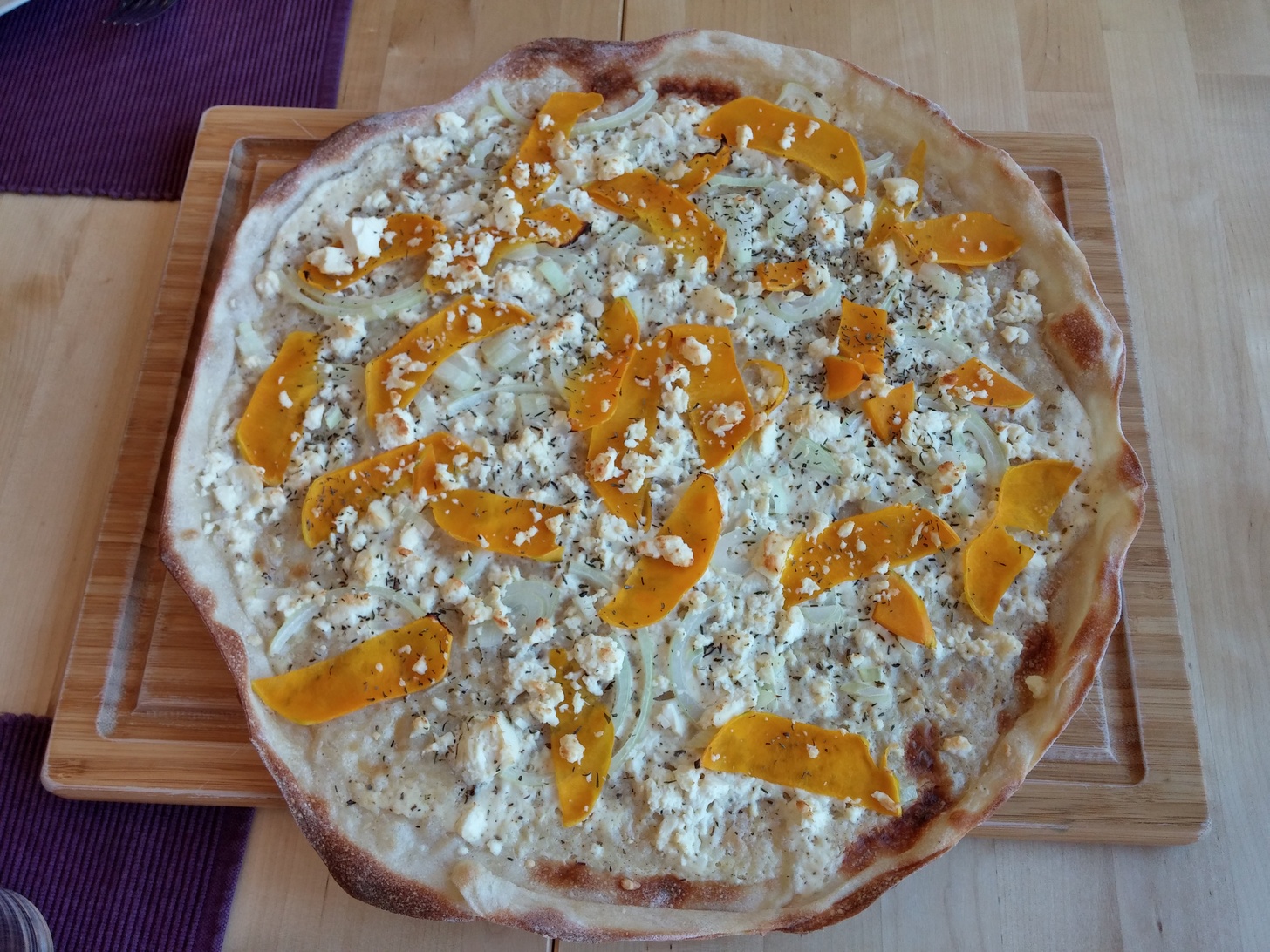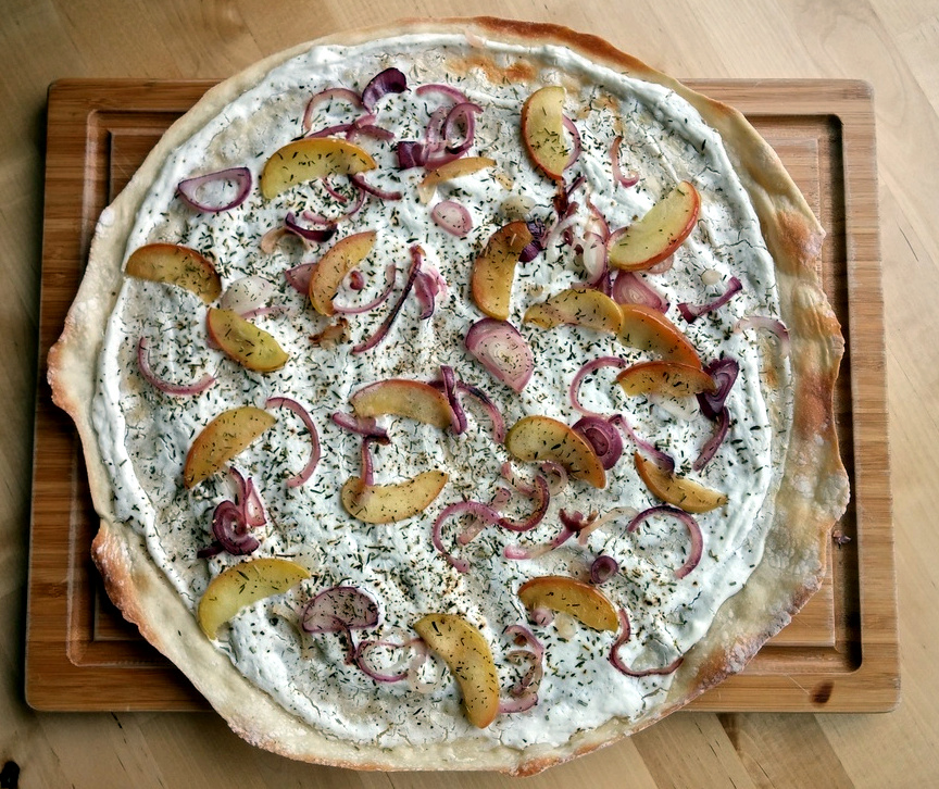 Flammkuchen lässt sich extrem vielfältig belegen. Die Standardvariante ist sicherlich der Flammkuchen Elsässer Art, der klassisch mit Crème Fraîche, die ich zuvor mit etwas Milch verfeinert und mit frisch gemahlenem Pfeffer und Salz sowie etwas frisch geriebener Muskatnuss gewürzt habe, bestrichen und mit Schinken und Zwiebeln belegt wird.