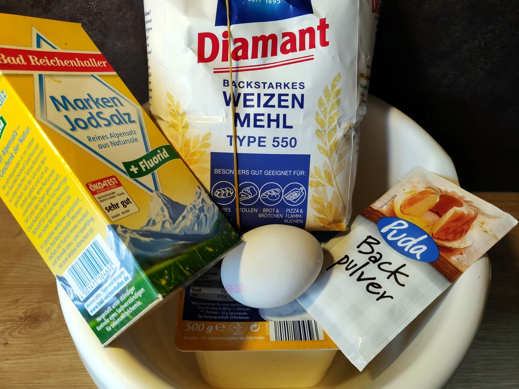 250 g Magerquark 250 g Weizenmehl Typ 550 1 Tüte Backpulver 1Ei Salz optional: etwas Honig