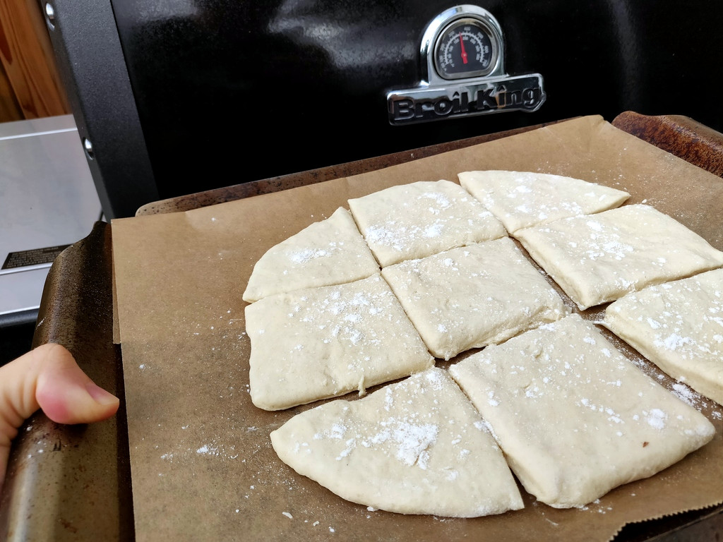 Den fertigen Teig gebe ich jetzt auf mein gelochtes Grillblech, das ich mit Backpapier ausgelegt habe. Mit einem Teigschaber zerteile ich den Teig in neun Brötchen, die lose nebeneinander liegen. Die Teiglinge benetze ich noch mit etwas Wasser und bestreue sie mit dem übrig gebliebenen Weizenmehl von der Arbeitsfläche.