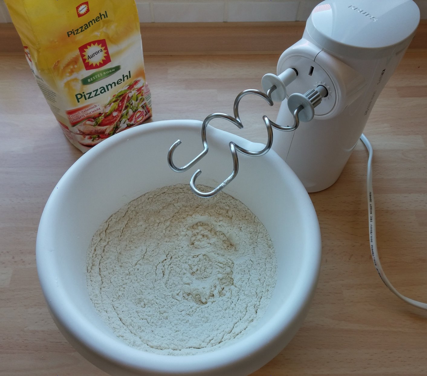 Zunächst die halbe Menge Mehl in die eine Schüssel tun und das Salz unterrühren. Nun in der Mitte eine Kuhle ausbilden und einen guten Schuss Olivenöl sowie das warme Wasser vollständig hineingeben. In die Flüssigkeit die Hefe geben und so lange verrühren, bis keine Hefeklumpen mehr vorhanden sind.