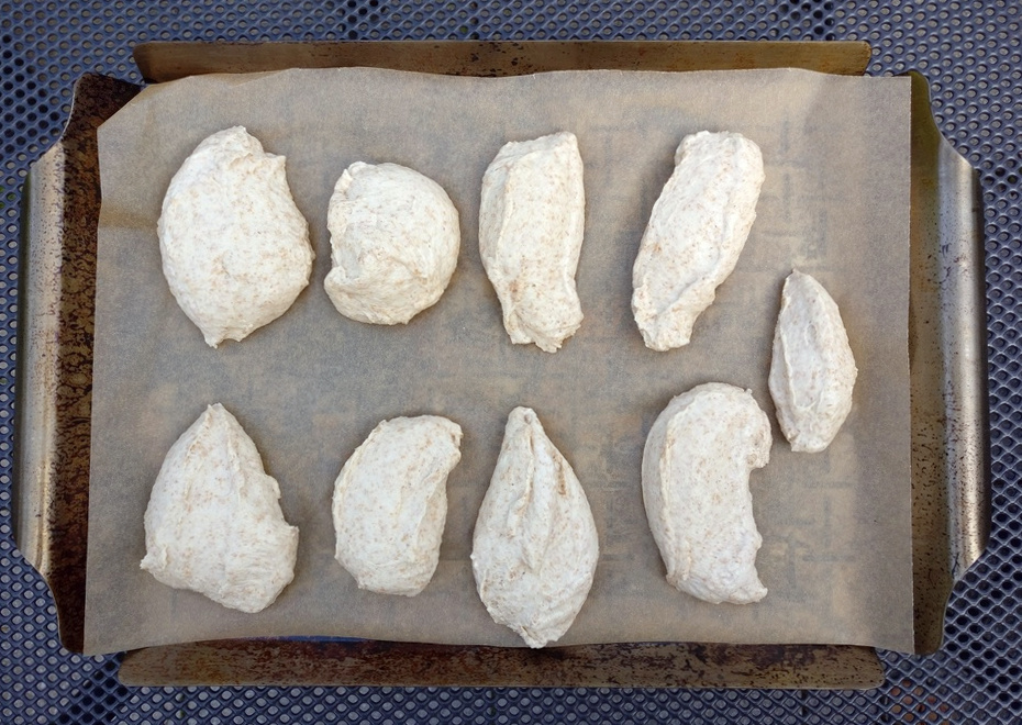 Als wesentlicher Unterschied in der Zubereitung kommt nun als nächstes eine Gehzeit für 30 Minuten an einem warmen Ort. In dieser Zeit vergrößert sich der Teig ordentlich. Nach Ablauf der Gehzeit teile ich acht bis neun Dinkel-Joghurt-Brötchen mit einem Teigschaber ab, die ich dann ohne weiteres Kneten auf mein Grillblech (mit Backpapier) lege.